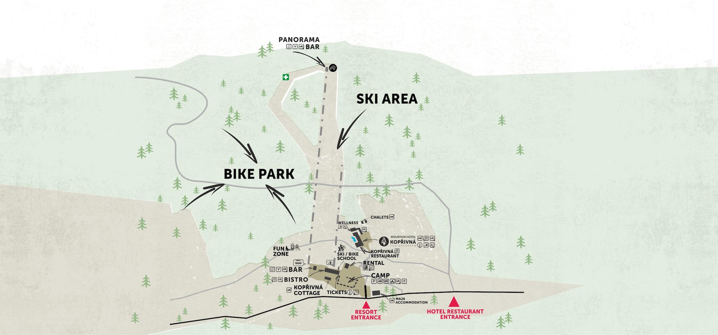 Kopřivná Resort pod Pradědem to idealne miejsce na aktywny wypoczynek – zimą oferuje ośrodek narciarski z możliwością jazdy na nartach i snowboardzie, latem adrenalionowy bikepark i park rozrywki dla rodzin z dziećmi, a przez cały rok – przejazdy kolejką linową, relaks w wellness z basenem, doskonałą restaurację, Bistro i bar Deštník oraz punkt widokowy Panorama z barem.