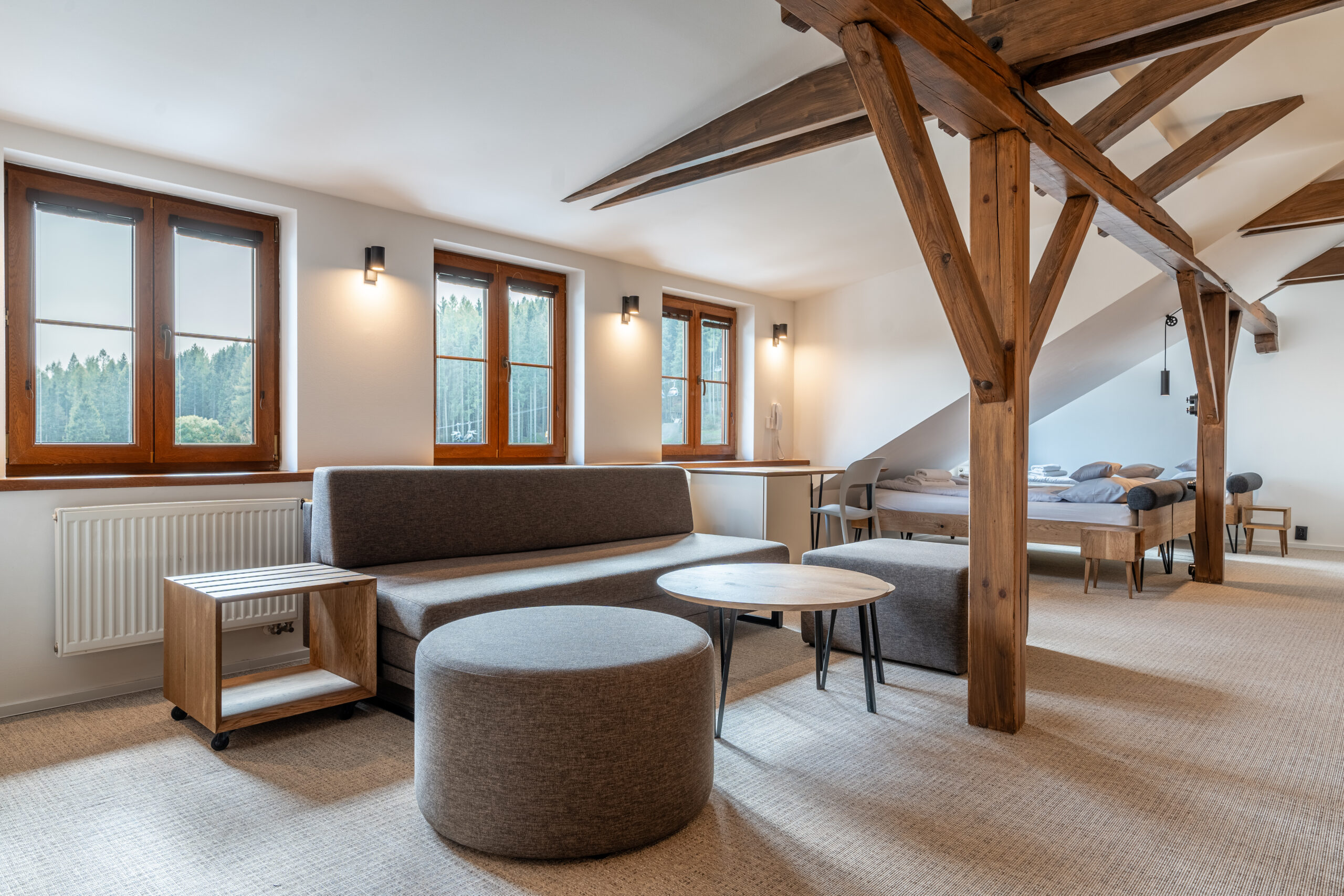 Pokoje w nowoczesnym designie dla 2–4 osób z łóżkiem małżeńskim i rozkładaną kanapą. Zlokalizowane na 2. i 3. piętrze hotelu z widokiem na parking lub basen.